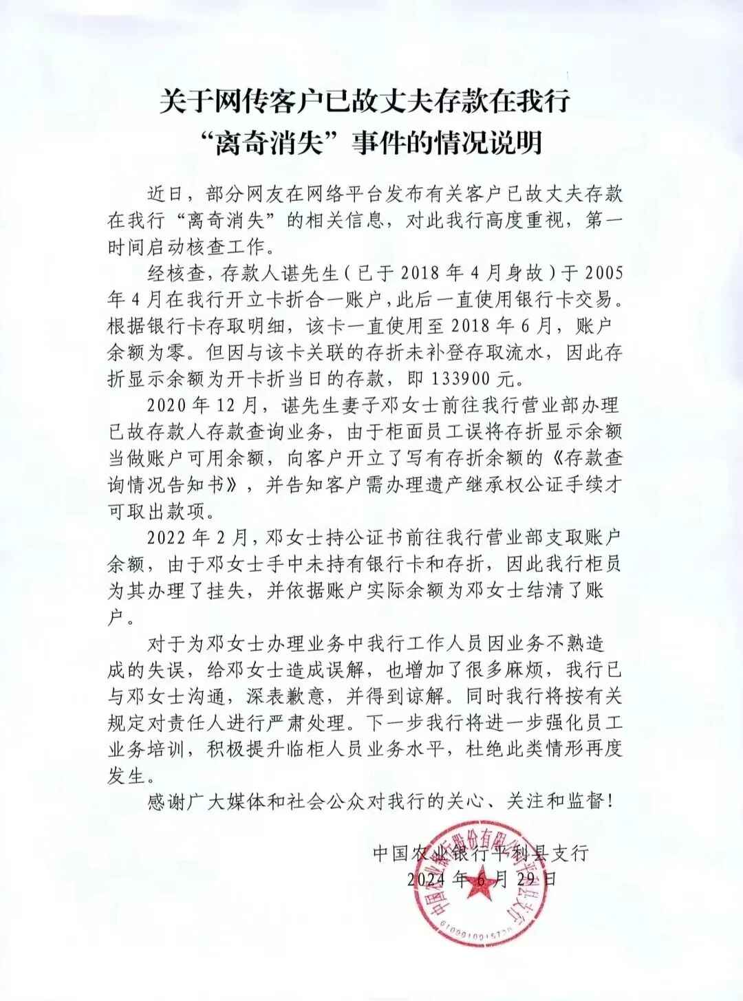 6月29日,中国农业银行平利县支行发布关于网传客户已故丈夫存款在该行“离奇消失”事件的情况说明,全文如下: