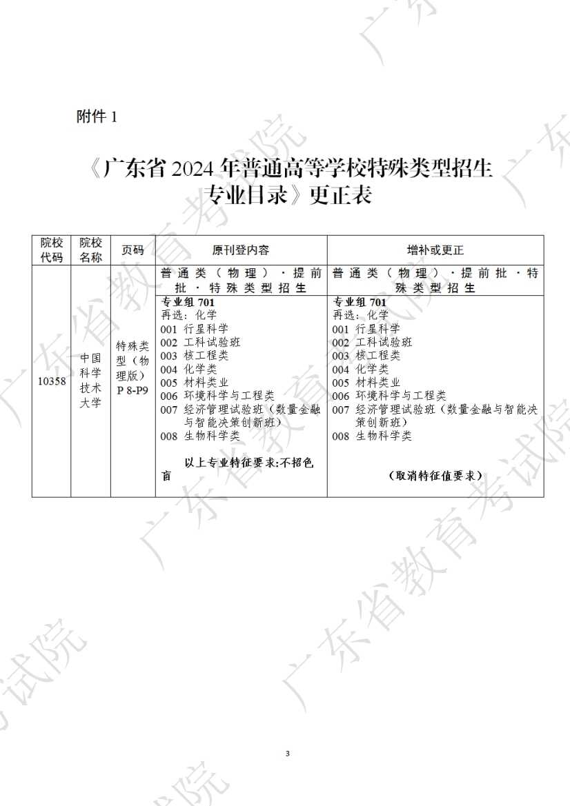 7月1日,广东省教育考试院宣布,应有关高校要求,现更正《广东省2024年普通高等学校招生专业目录》部分内容。记者看到,此次专业目录调整主要涉及中国科学技术大学。