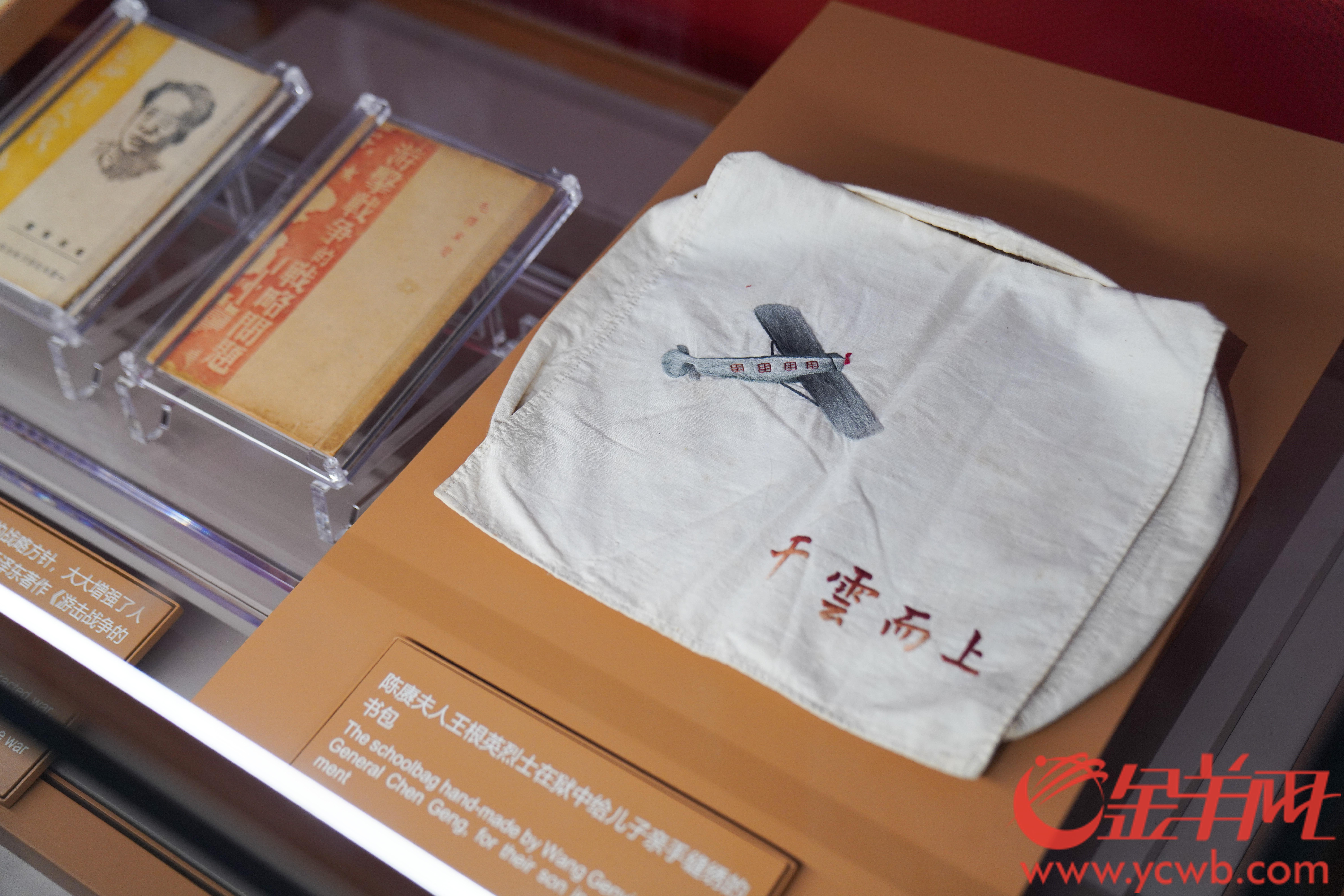 在中共一大纪念馆,一只书包静静地躺在藏品柜里。书包上,密密的针脚绣出一架腾空而起的飞机,飞机右下方绣有四个字“干云而上”。这是1935年陈赓夫人王根英在狱中绣给儿子的书包。书包透着浓烈的母爱,寄托着王根英对儿子立志高远、报效祖国的深切期待。