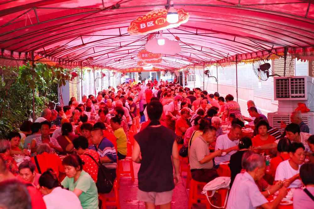 当天中午11时30分,石牌村内池氏、董氏、潘氏三个祠堂及新庆村花园小区4楼坐满了欢声笑语的老人,石牌三骏企业集团(石牌村改制公司)出资组织的专属村内有福利股的退休股东的龙船宴正在举办,2200多名退休长者参加了本次宴席。