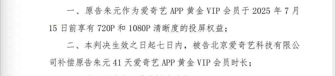朱元告诉记者,“爱奇艺限制投屏案”一审判决结果是:原告作为爱奇艺APP黄金VIP会员,在2025年7月15日前享有720P和1080P清晰度的投屏权益;本判决生效之日起七日内,爱奇艺公司补偿原告41天的黄金会员VIP会员时长。