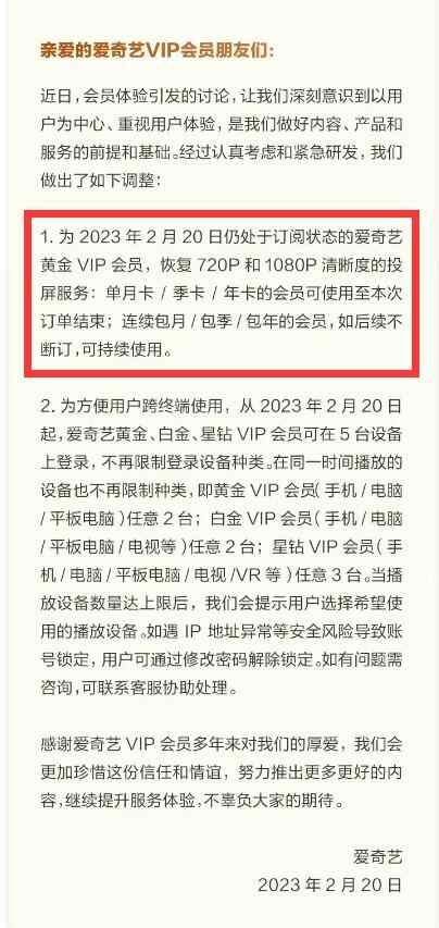2023年2月20日,爱奇艺通过官方微博发布关于爱奇艺会员服务优化情况说明,对投屏功能作出调整,仍处于订阅状态的爱奇艺黄金VIP会员,恢复720P和1080P清晰度的投屏。