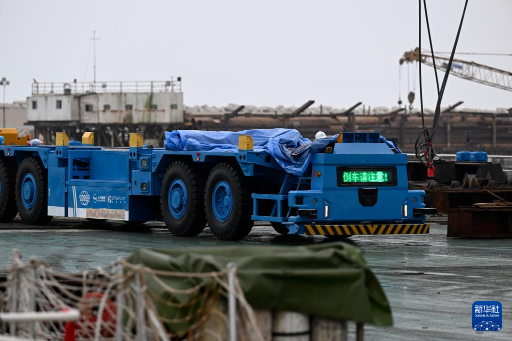 这是6月21日在秘鲁钱凯港码头操作区拍摄的具备自动驾驶技术的电动集装箱卡车。 新华社记者 李木子 摄