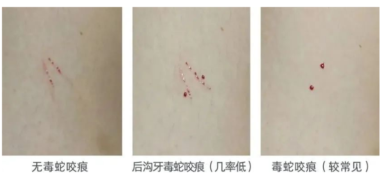 如果意外被蛇咬了,保持冷静,可以根据咬痕进行初步判断,是无毒蛇还是有毒蛇。