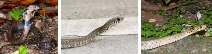 舟山眼镜蛇(左,有毒)滑鼠蛇(中)、黄斑渔游蛇(右)