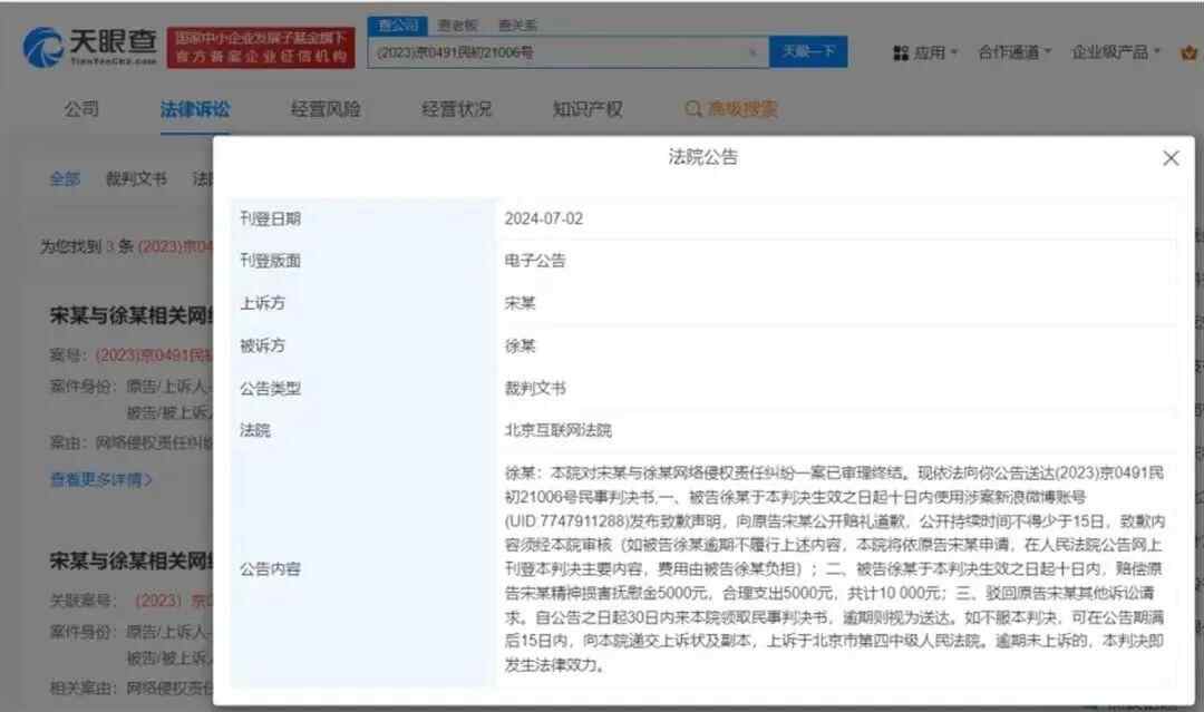 据潇湘晨报消息,近日,记者从天眼查APP获悉,北京互联网法院向徐某公告送达宋轶与其网络侵权责任纠纷案件判决书,判决徐某向宋轶公开赔礼道歉,并赔偿精神损害抚慰金5000元、合理支出5000元。
