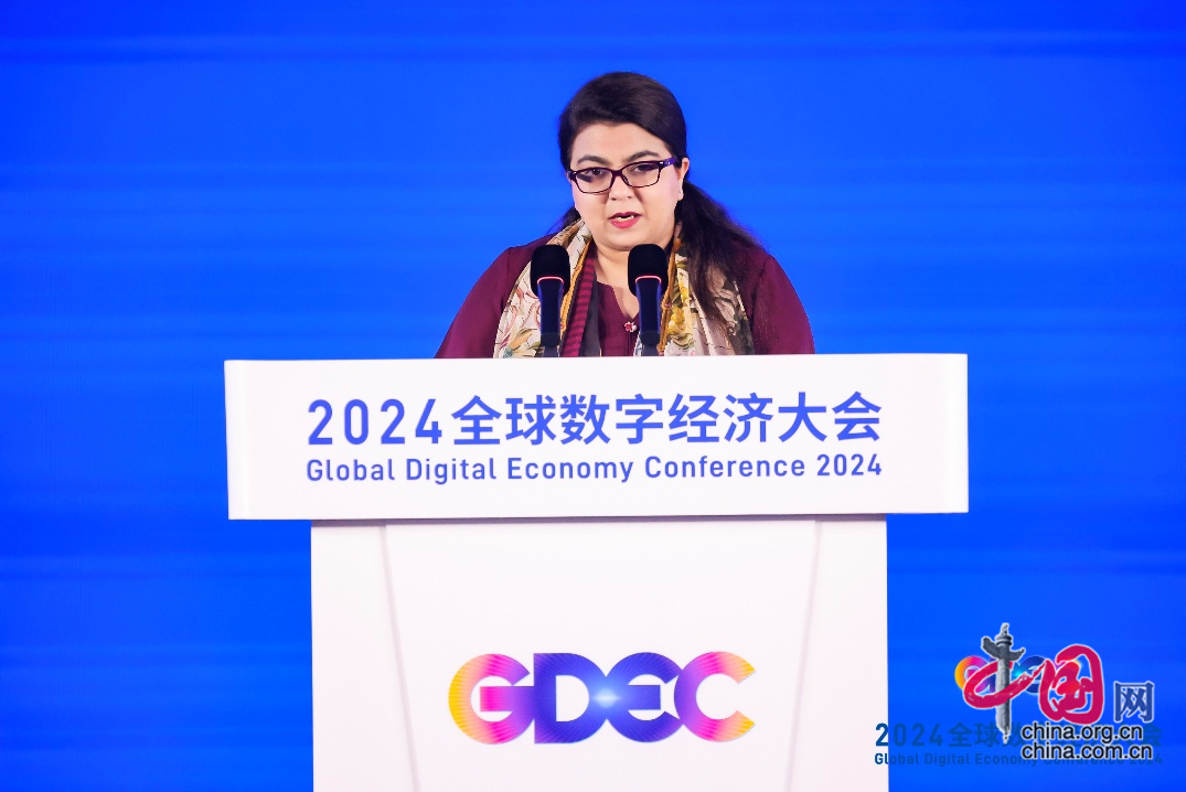 巴基斯坦信息技术和通信部部长莎萨·法蒂玛·赫瓦贾在2024全球数字经济大会开幕式上致辞