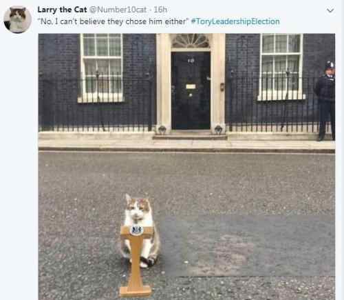 2019年7月23日,约翰逊赢得英国保守党党魁选举,将接任特蕾莎⋅梅担任英国首相,入主唐宁街。在该消息宣布后,拉里第一时间发文。不过,它似乎对新的主人有点小失望。拉里写道:“不,我也不敢相信他们居然选了他。”