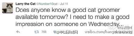 当时拉里对于新一任“铲屎官”特蕾莎·梅拉的到来还发文表示,有没有人知道好的猫咪造型师,我想在周三给某人留个好印象。