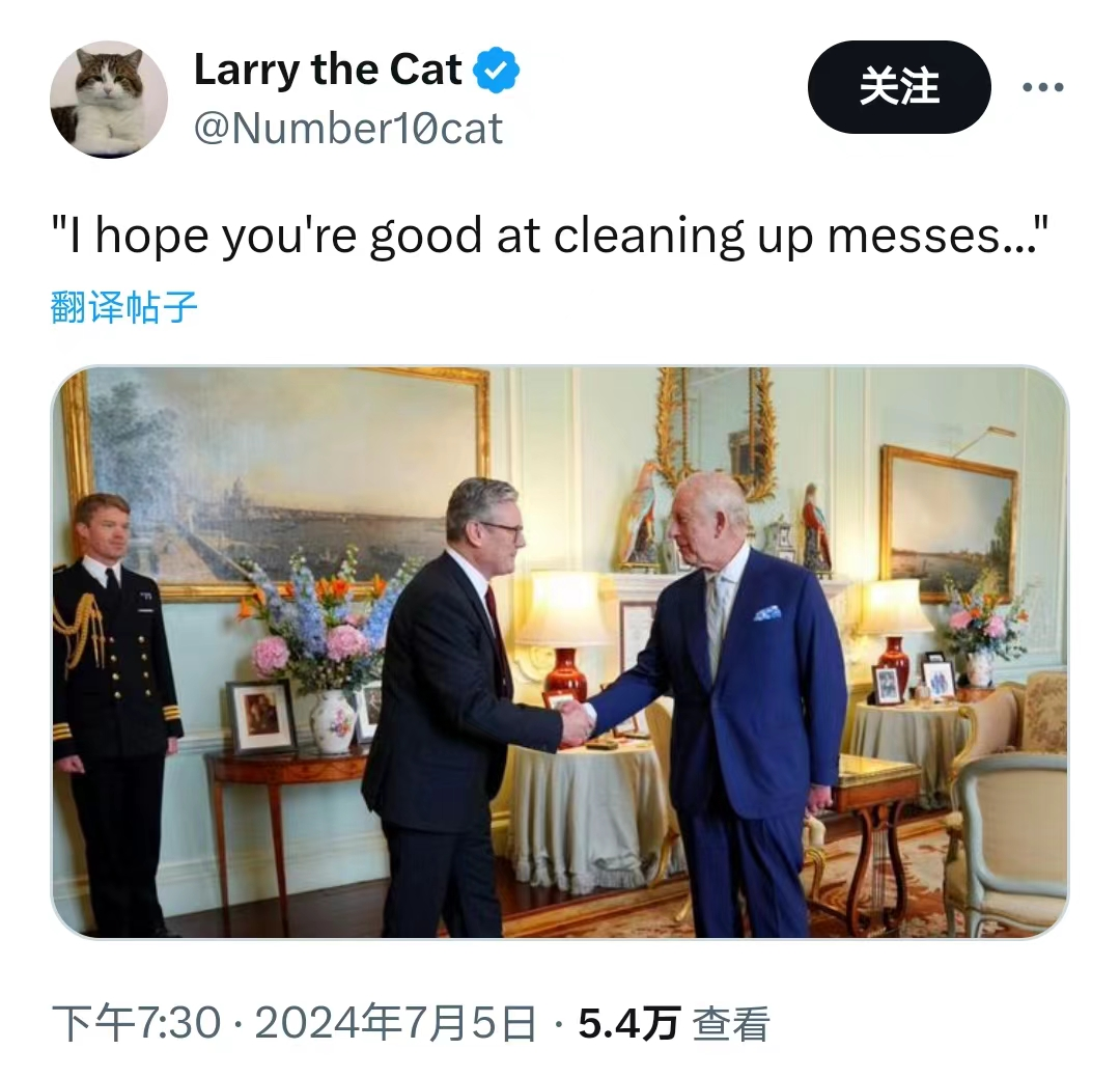 而在英国国王任命斯塔默为首相后,拉里也发文表态:“我希望你擅长收拾残局……”