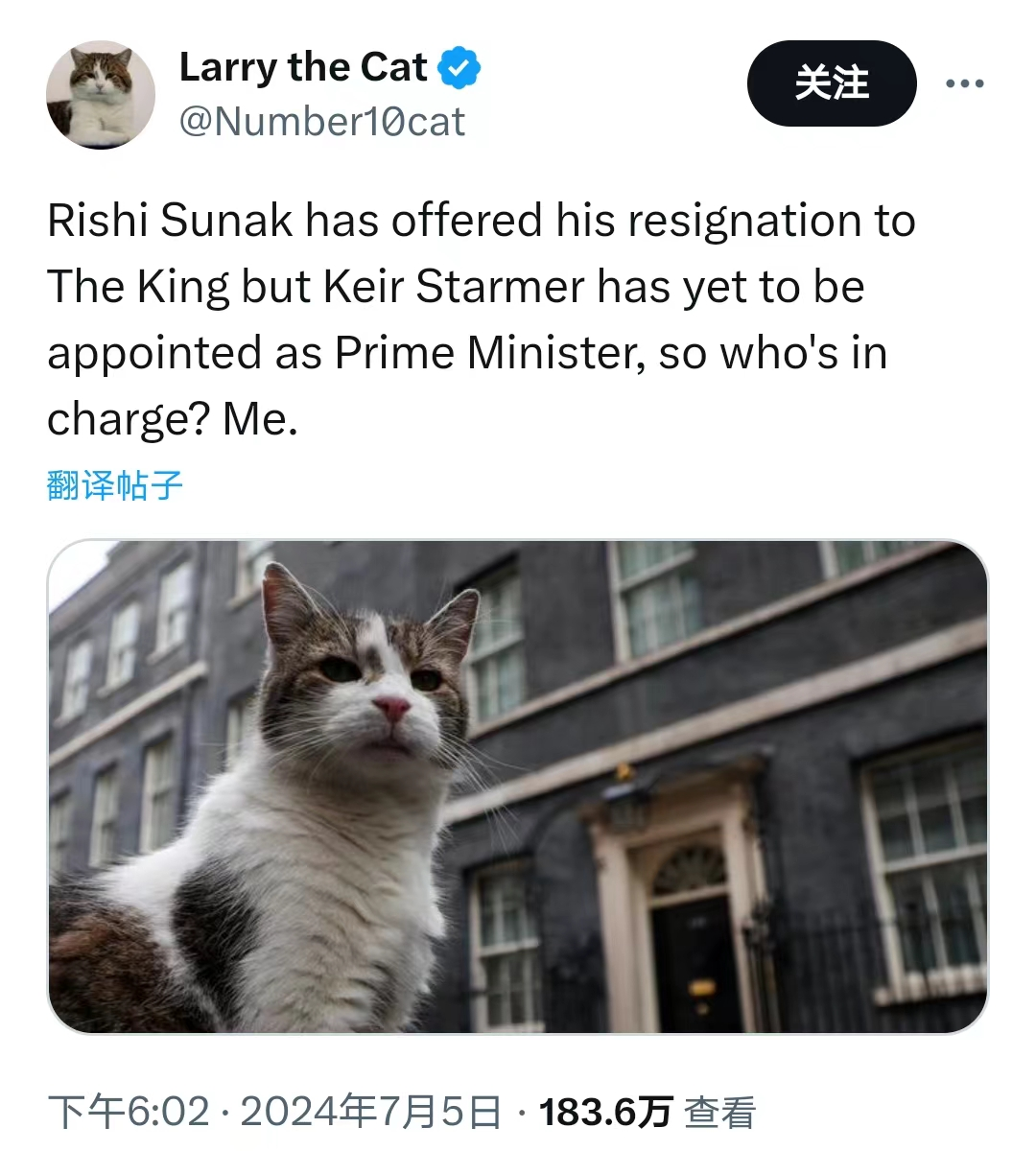 在新旧首相交替之际,“唐宁街10号首席捕鼠官”拉里发文表示,苏纳克已向国王递交辞呈,但斯塔默还未被任命为首相。那么现在谁来主管?我。