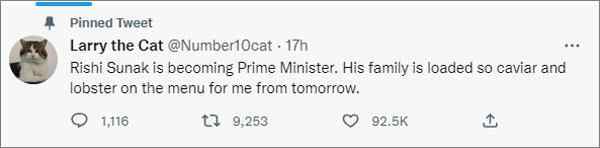 2022年10月24日,苏纳克正式入主唐宁街10号,成为拉里的第五任“铲屎官”。拉里10月24日还专门发文“喊话”苏纳克:“新首相家超富有,明天开始,我的菜单里会有鱼子酱和龙虾了。”