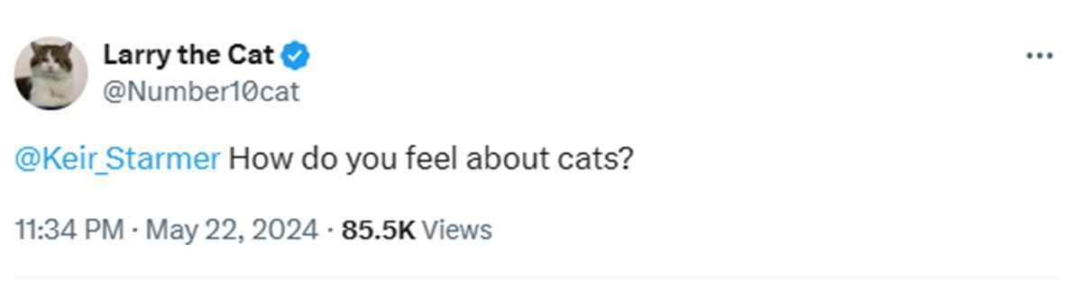 其实,早在5月22日苏纳克宣布英国将于7月4日举行大选后,拉里接连发布数条帖文,甚至还直接@斯塔默 并喊话:“斯塔默,你觉得猫怎么样?”