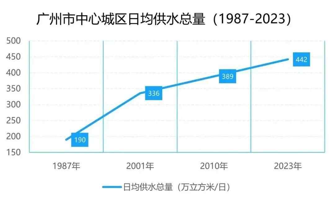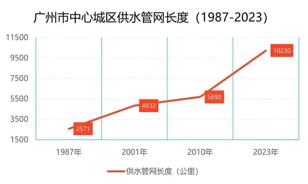 六运会成就了天河新城,九运会加速了广州东扩的步伐,亚运会让广州走向国际化。纵观广州近20年的高速发展,几乎就是以这几次重大赛事为起点。广州供水事业抓住综合性运动会重大契机,与城市发展同频共振。截至2023年12月底,广州中心城区日均供水总量442万立方米/日,供水辐射面积1145平方公里,管网长度10230公里,服务人口超1100万人。