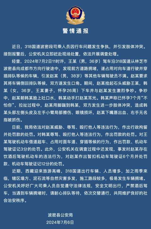 日前,波密县公安局依法对赵某威胁、辱骂、殴打他人等违法行为,作出行政拘留并处罚款的处罚。对韩某辱骂、殴打他人等违法行为,作出罚款的处罚。对王某驾驶机动车借道超车、占用对面车道、穿插等候的行为,作出罚款、机动车驾驶证记3分的处罚。此外,公安机关在调查过程中还发现,事发时赵某存在饮酒后驾驶机动车的违法行为,对赵某作出暂扣机动车驾驶证6个月并处罚款、机动车驾驶证记12分的处罚。