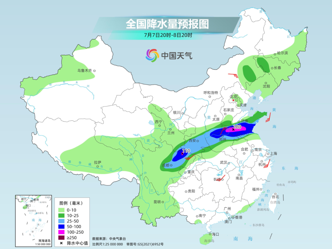 预计今明两天,四川盆地-陕西南部-黄淮一带将出现新一轮强降雨和强对流天气过程。并且降雨落区将与前期强降雨落区部分重叠,其中,河南中北部、山东一带仍然是降雨核心区域,需防范降雨叠加造成的不利影响。