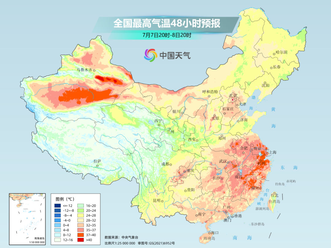 再看江南华南,高温“持久战”仍在继续。未来三天,在副热带高压的控制下,江南、华南大部以及江淮等地的高温天气仍将持续,最高气温可达35~38℃,局地可能更高,暑热从早到晚不间断。