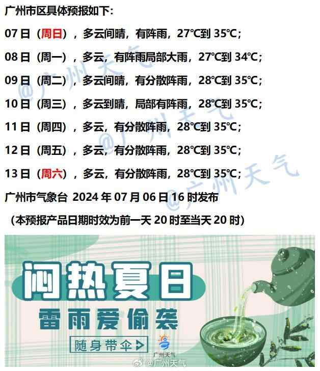 广州“烧烤”模式开启,全市各区高温黄色预警生效中,需注意防暑降温防晒、及时补水。午后偶有雷雨发展,出门宜带伞,遮阳又挡雨。