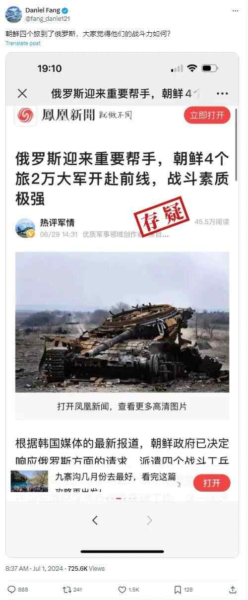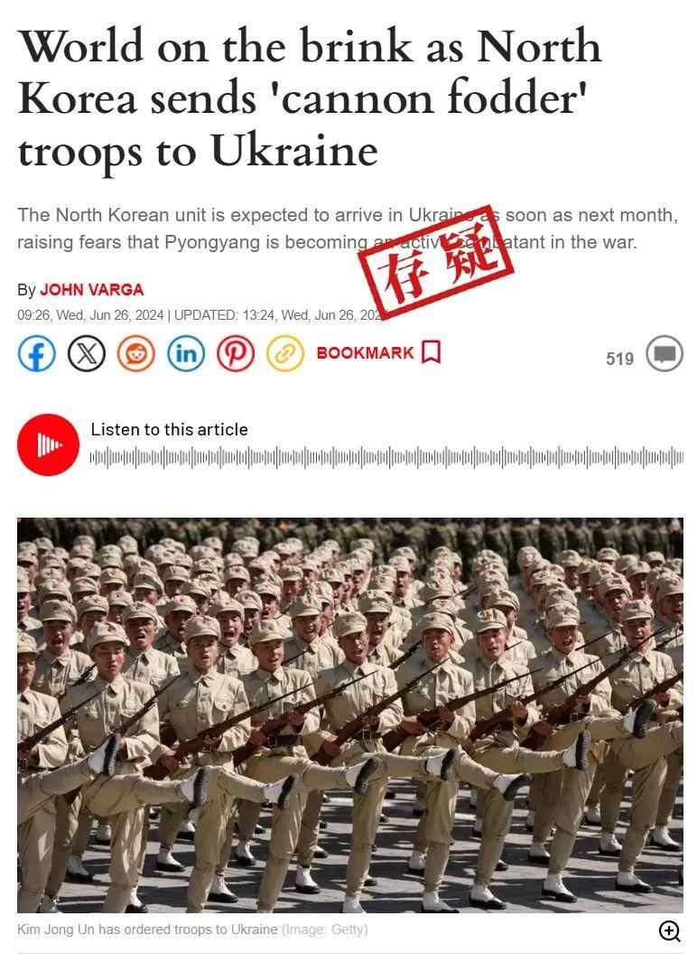 这段对话很快被英国小报《每日快报》捕捉到。6月26日,《每日快报》发表了标题为《朝鲜向乌克兰派遣 "炮灰 "部队,世界岌岌可危》的文章。文中以确定的口吻称“朝鲜将向乌克兰派遣军事部队以支持俄罗斯的战争”。