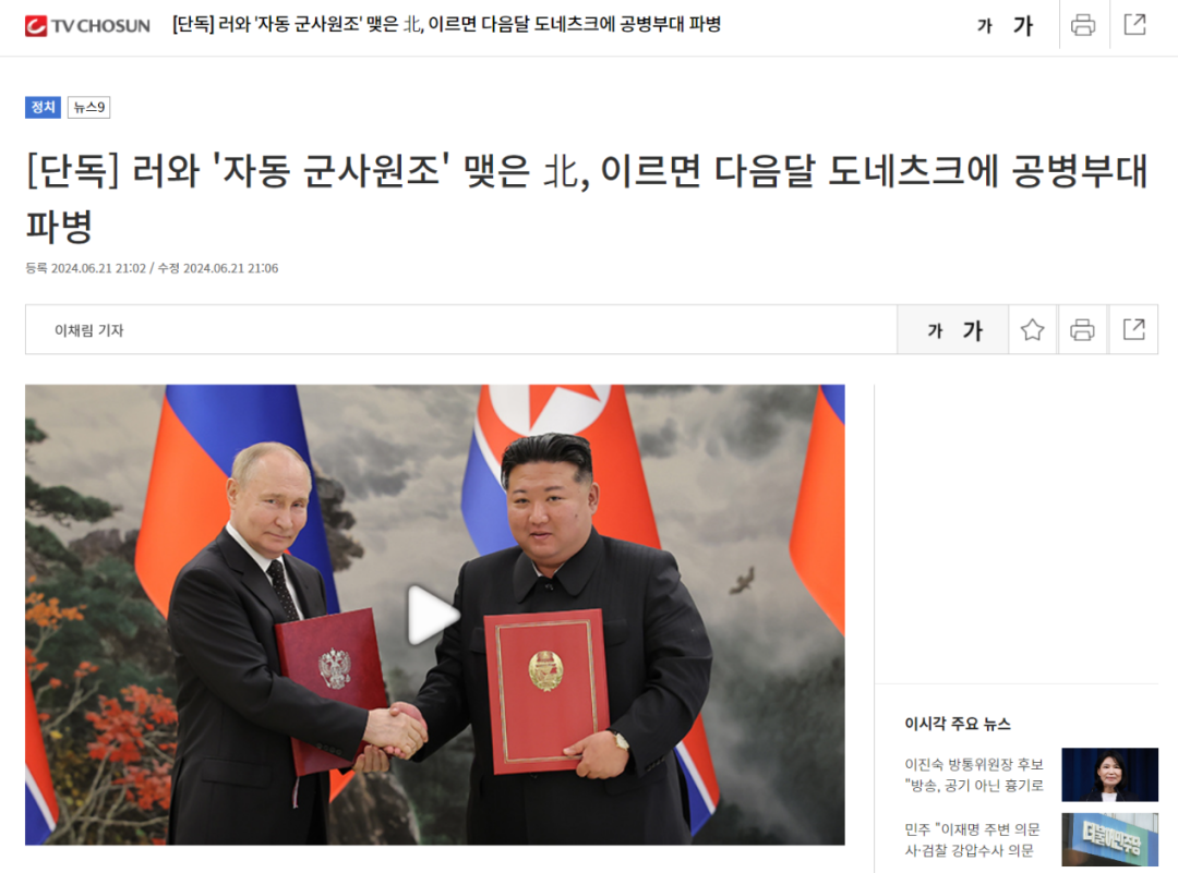 6月24日,路透社发布了一篇有关朝鲜军方官员谴责美国允许乌克兰使用美制武器对俄罗斯目标实施反击的文章,其中提到“TV朝鲜”频道的上述说法。