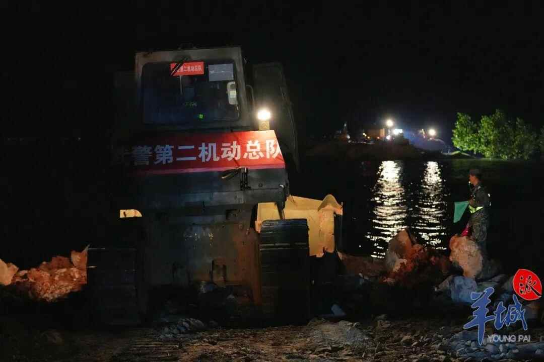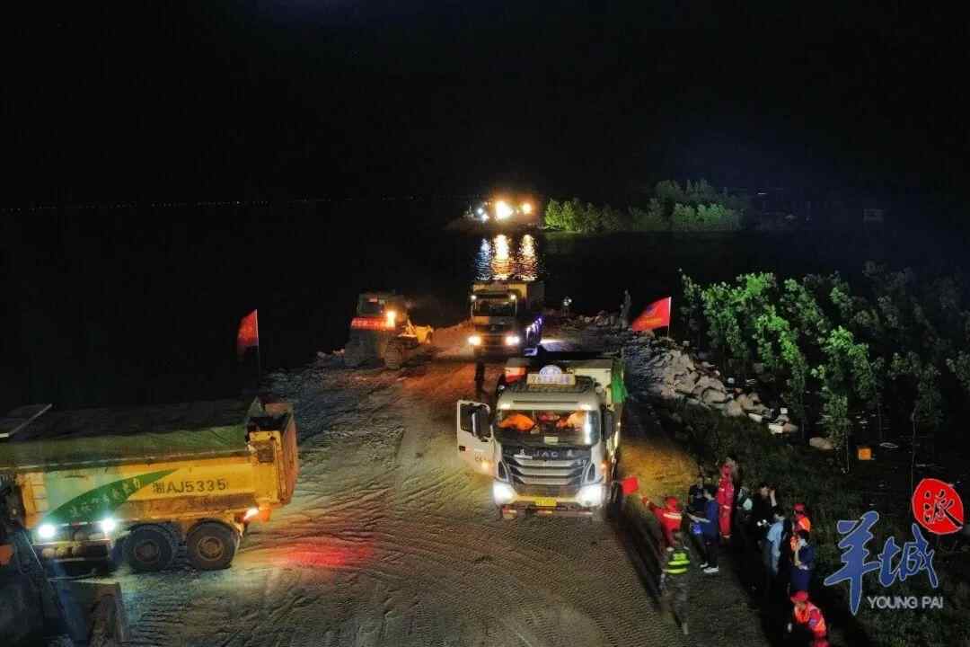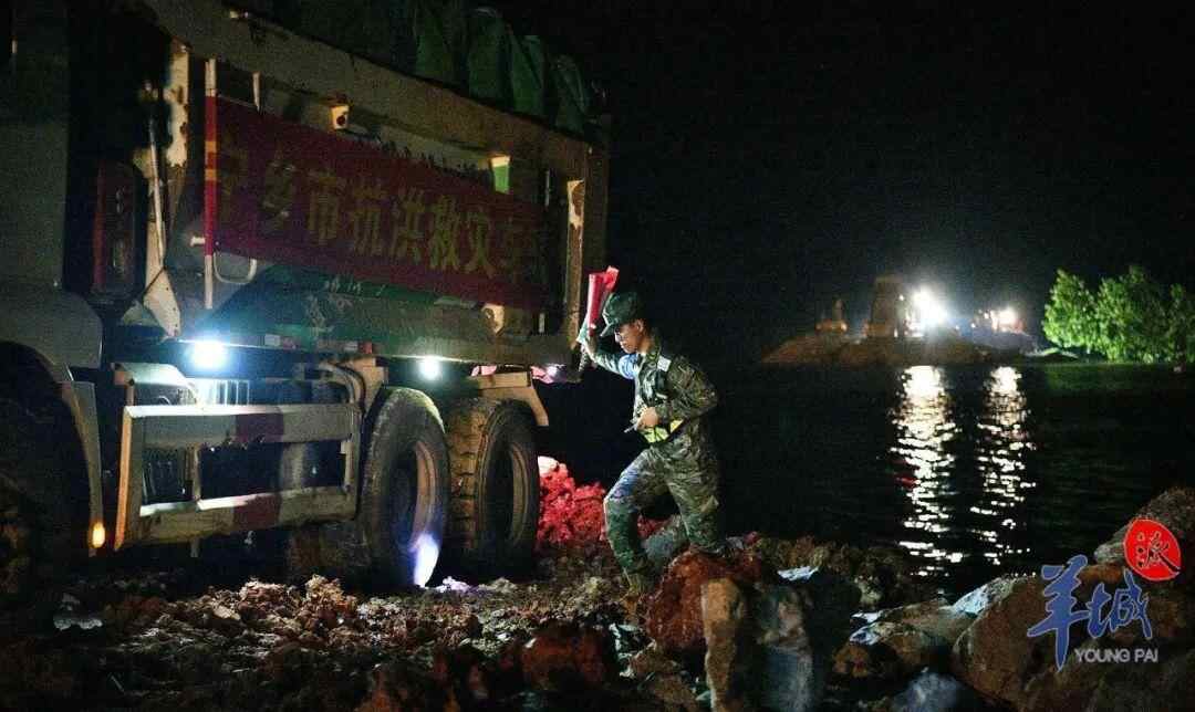 洞庭湖决堤现场,武警部队连夜运送砂石封堵决口