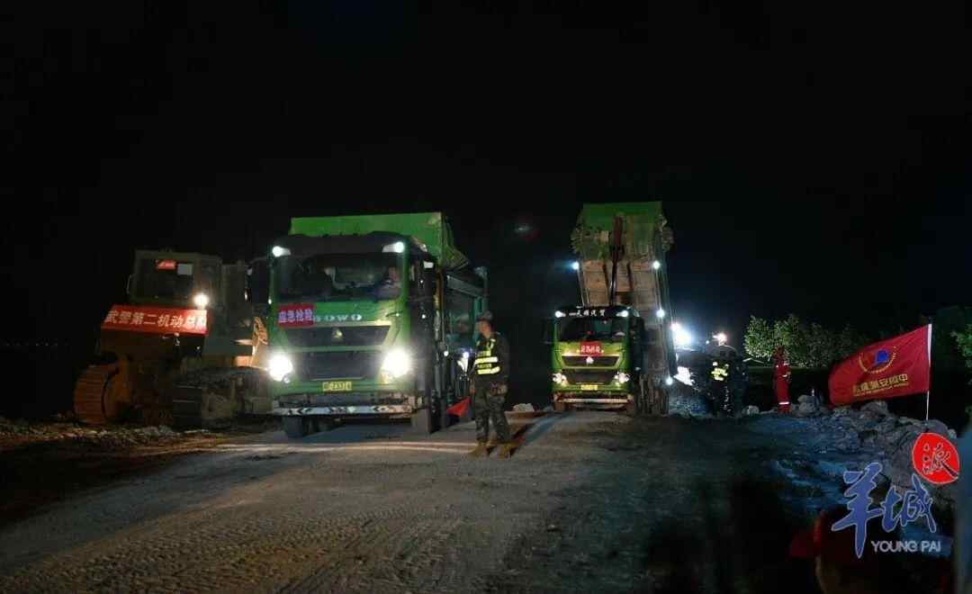 成队的卡车载着石块在堤顶路上排队前往溃口现场,湖面上多艘船只停靠在溃口附近待命。施工人员表示,根据先期制定的方案,抢险队伍将争分夺秒开展堵口作业。目前填土工作进行顺利,预计工期为3天,后续几天将持续开展24小时昼夜作业。