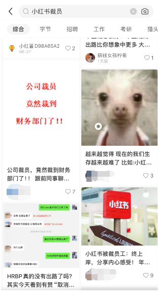 记者在小红书上搜索小红书裁员,其中,有不少帖子中提到被裁员。
