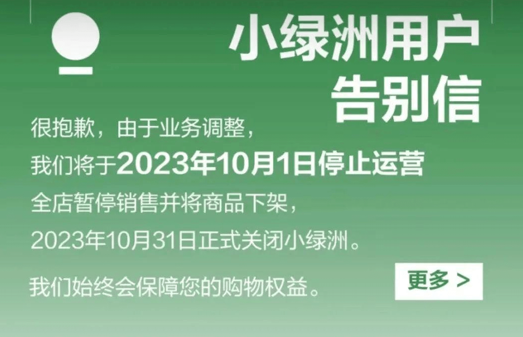 在此之前,小红书旗下电商平台“小绿洲”也发布了用户告别信,表示由于业务调整,经过郑重的考虑,“小绿洲”于2023年10月1日停止运营,商品停止销售,2023年10月31日正式关闭“小绿洲”。