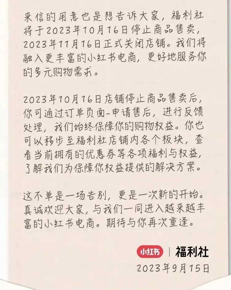 2023年9月,小红书“福利社”发布致用户的一封信《是告别,更是开始》,意味着小红书自营电商平台将全部关闭。
