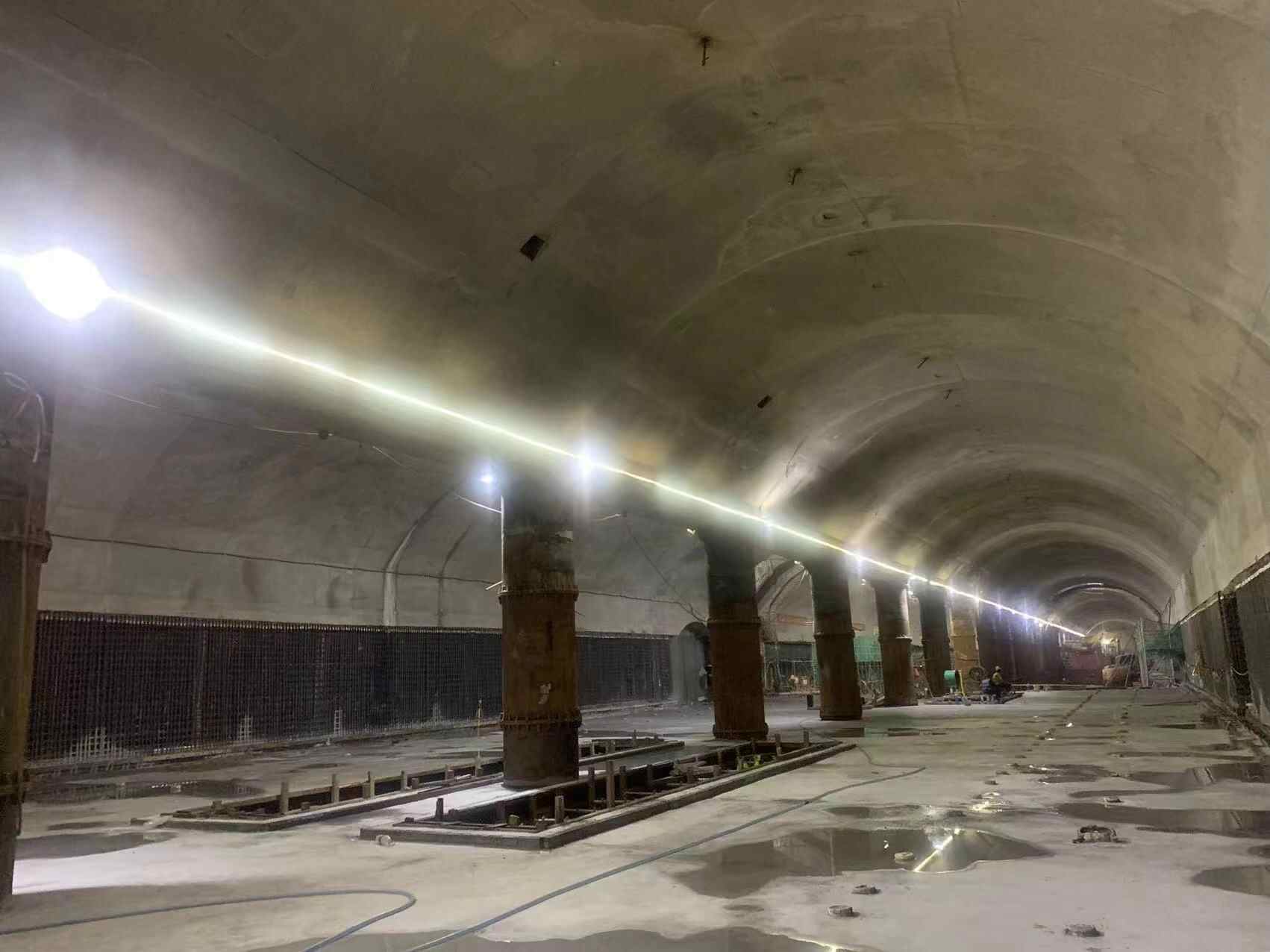 由于车站位于城市主干道下方,地面交通繁忙、地下管线繁杂,施工场地非常有限。为了最大限度地减少施工对市民出行影响,该站采用“拱盖法”暗挖施工,首先通过竖井在地下进行开挖,在导洞内施作桩、梁、拱等形成初支拱盖,在扣拱二衬完成后下挖至中板以下,施作中板及边墙,待上述步骤完成后继续下挖至基底,再做底板和中板以下边墙。