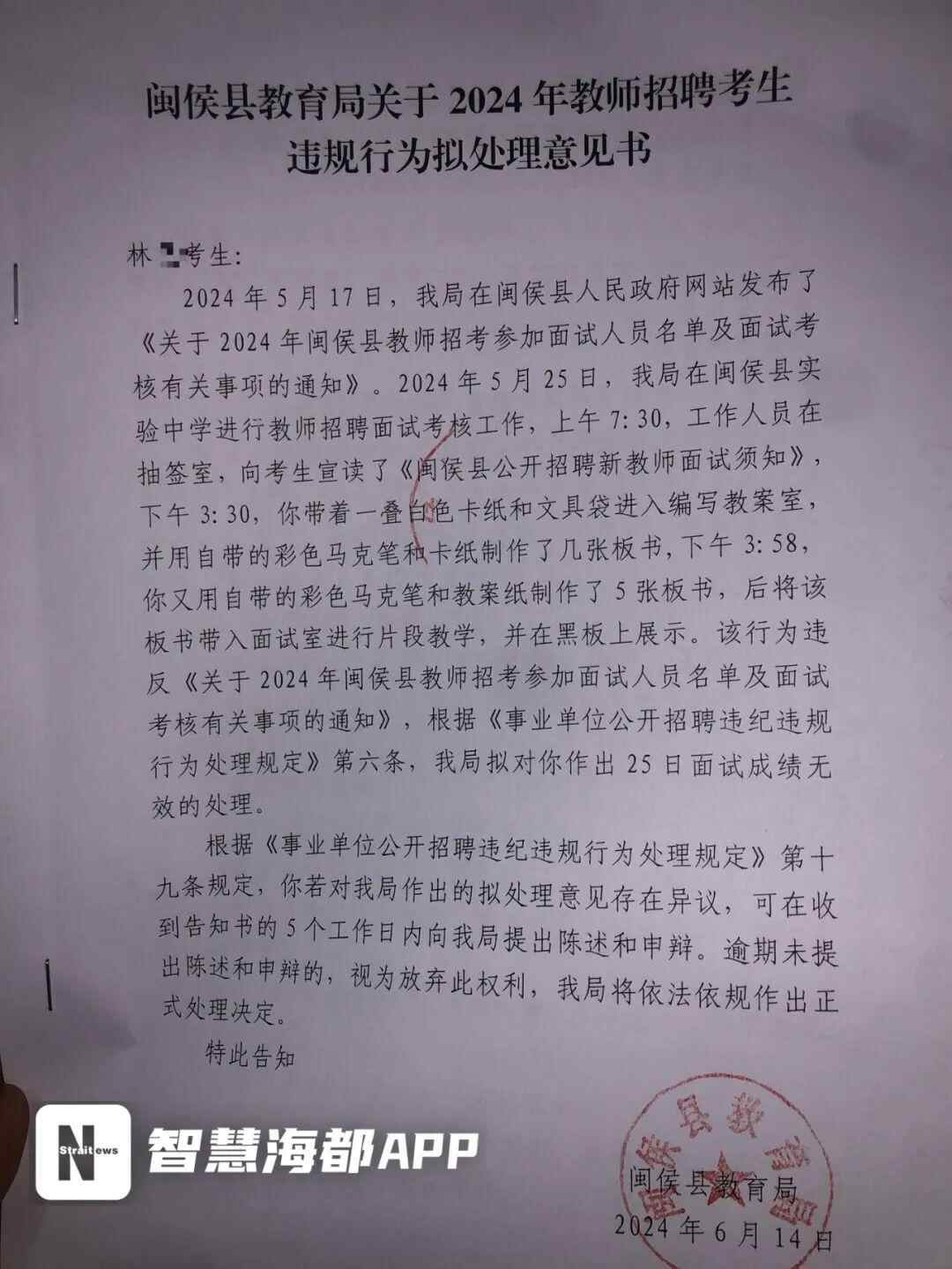 6月14日下午,向当事考生出示了《闽侯县教育局关于2024年教师招聘考生违规行为拟处理意见书》,并告知其享有陈述和申辩的权利。