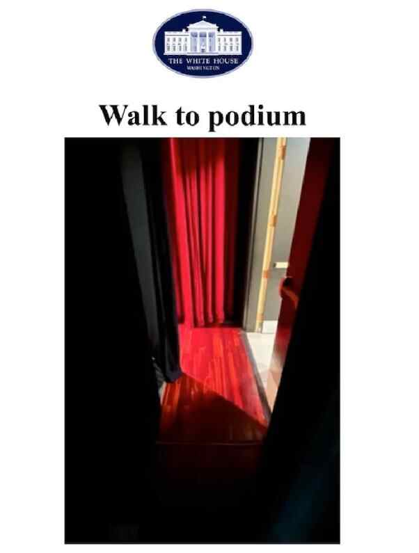 最令他感到震惊的是,在白宫团队为拜登准备的行动文件中不仅用大号字体提醒他“朝观众看”,还有2页PPT用大幅照片加上简单文字提醒拜登怎样走到讲台上去,尽管从幕后到台前也不过短短几步路而已。