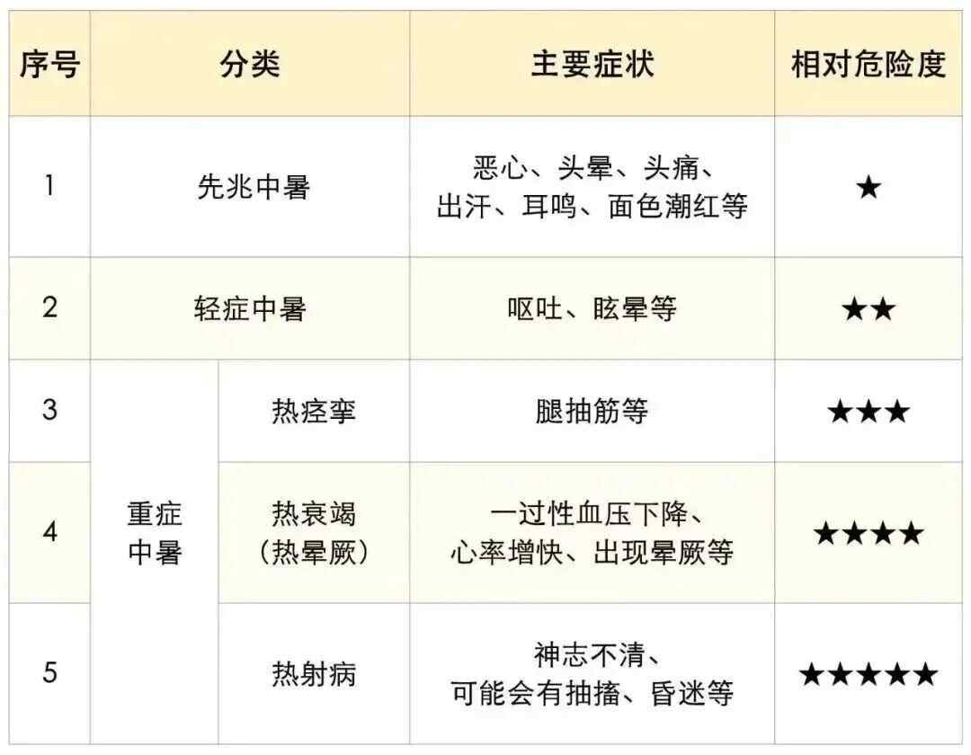 从临床表现来看,中暑由轻到重可分为3大类:先兆中暑、轻度中暑、重度中暑。