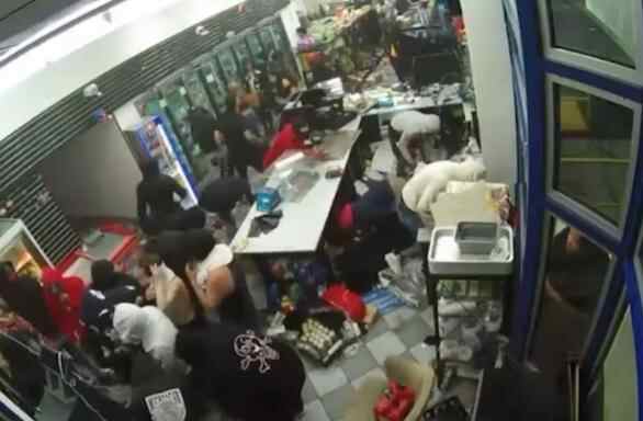 这起事件发生在5日凌晨4时30分左右。店主表示,当时有近百人破门而入洗劫店铺,造成了数千美元的损失,“货架被拉倒了,所有的物品都被他们踩踏和破坏。”监控视频显示,大批抢劫者在店内随意掠夺,抢走了冰箱里的饮料、货架上的食品,一些人还爬过收银台抢走柜台下的物品。