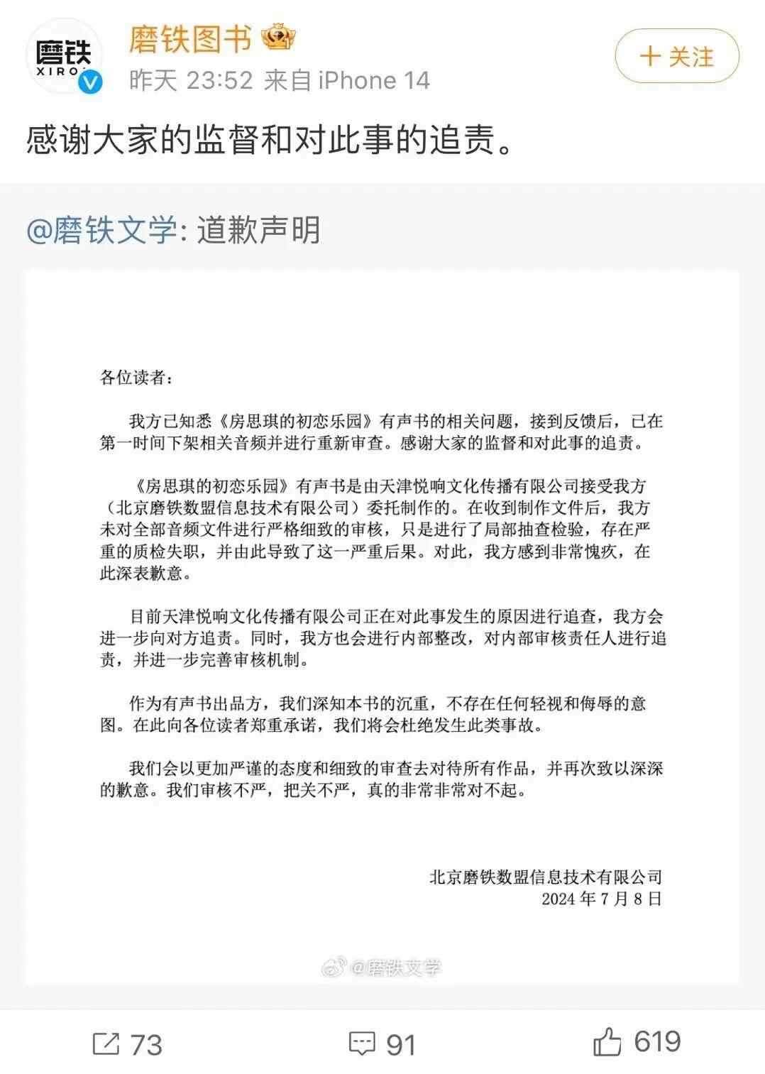 磨铁图书称,《房思琪的初恋乐园》有声书是由天津悦响文化传播有限公司接受我方(北京磨铁数盟信息技术有限公司)委托制作的。在收到制作文件后,我方未对全部音频文件进行严格细致的审核,只是进行了局部抽查检验,存在严重的质检失职,并由此导致了这一严重后果。对此,我方感到非常愧疚,在此深表歉意。