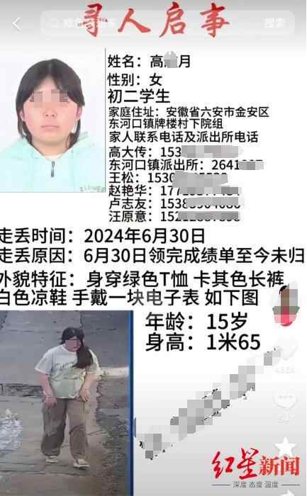 近日,安徽六安一名15岁女孩失联多日的消息引发关注。据了解,该女孩名叫高某月,家住安徽省六安市金安区东河口镇牌楼村,6月30日到学校领完成绩单后失联。失联时身穿绿色T恤,卡其色长裤,白色凉鞋,手戴一块电子表。
