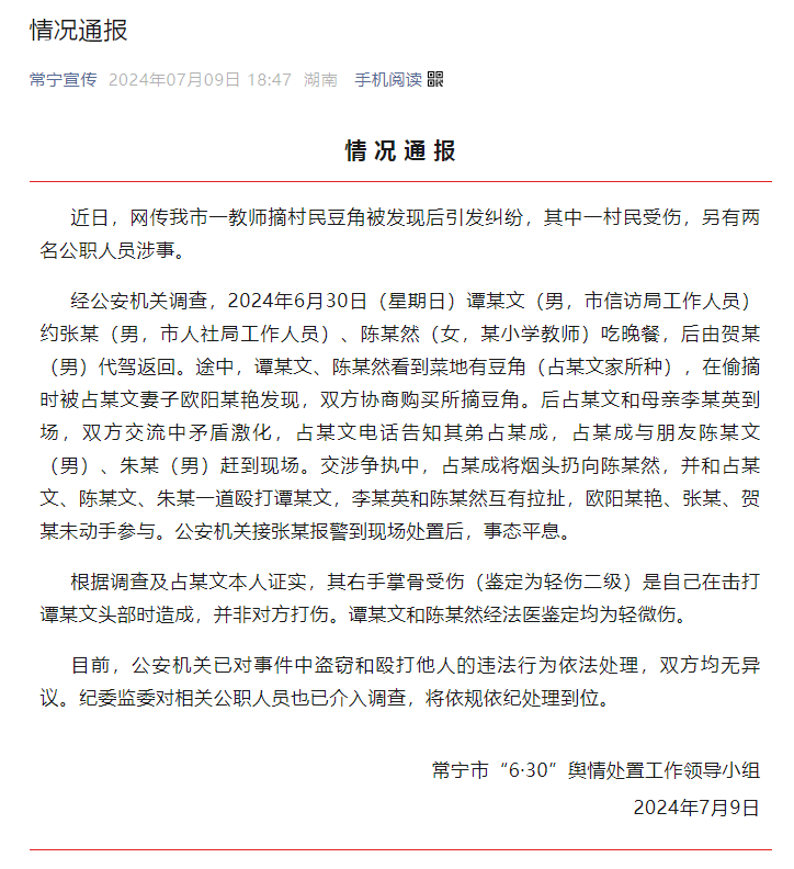 近日,湖南衡阳常宁市一名老师和两名公职人员摘村民豆角引起纠纷。7月9日,官方发布情况通报: