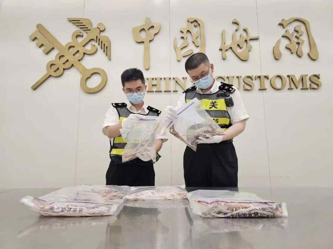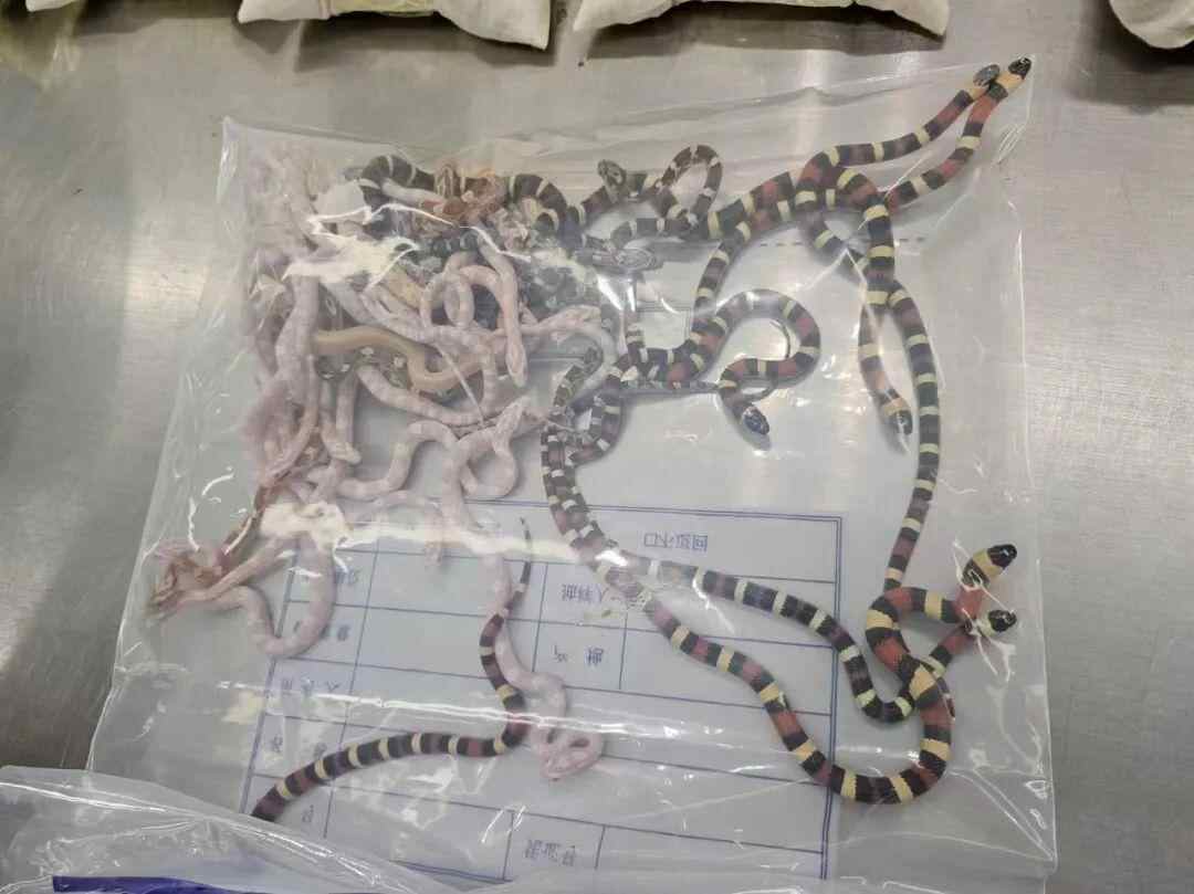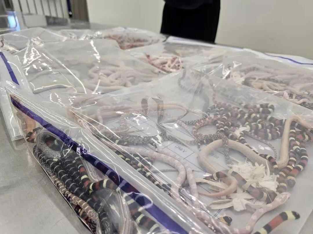 日前,一名男性旅客经深圳福田口岸旅检大厅“无申报通道”进境,被海关关员拦截检查。海关关员发现该旅客所穿裤子口袋内装有使用胶带密封的束绳帆布袋6个,拆开后发现每个袋内均装有多条色彩斑斓、形态各异的活体蛇。经清点,共计104条。