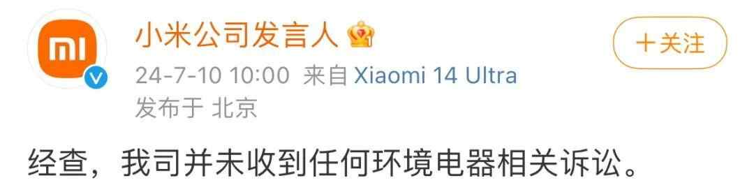 10日上午,小米公司发言人官微回应称:经查,我司并未收到任何环境电器相关诉讼。