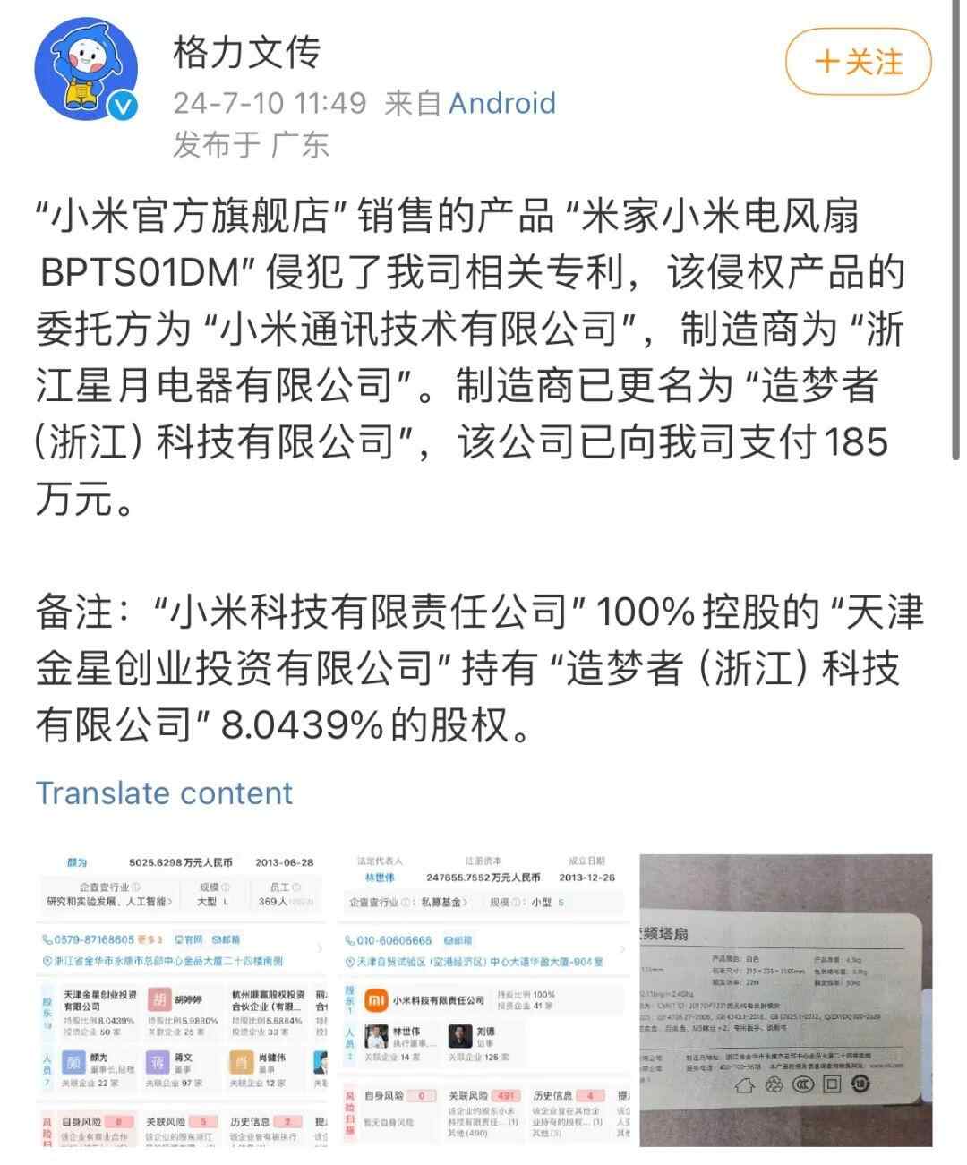 10日中午,格力文传再发微博称,“小米官方旗舰店”销售的产品“米家小米电风扇BPTS01DM”侵犯了我司相关专利,该侵权产品的委托方为“小米通讯技术有限公司”,制造商为“浙江星月电器有限公司”。制造商已更名为“造梦者(浙江)科技有限公司”,该公司已向我司支付185万元。