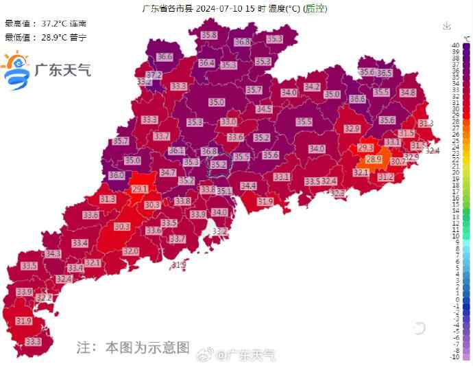 截至7月10日15时,大鸡腿已经红到发紫,最高气温已飙升到37.2℃(连南)。广东中北部气温半数在35℃以上,南部气温在33℃左右,水泥和沥青地面的温度应该都超过了50℃。