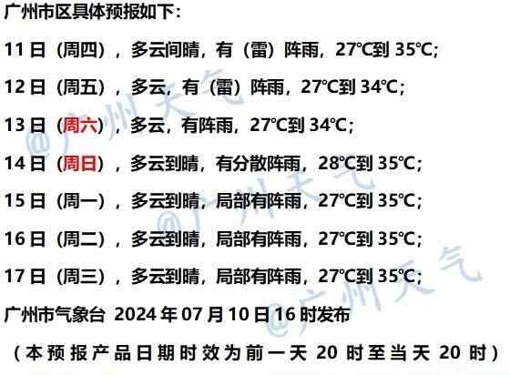 11日,珠江三角洲和粤东市县多云,有分散(雷)阵雨,局部大雨或暴雨,其余市县多云,局部有(雷)阵雨。最高气温:粤北和珠江三角洲市县34~37℃,其余市县31~34℃。