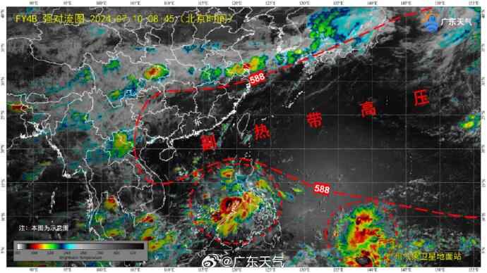 俗话说热极生风,从卫星云图可以看到,在副高南侧有多个热带云团发展,代表副高的588线如同顺时针旋转的手扶电梯,海上热带云团将沿着它逐渐西行。预计本周六(13日),位于菲律宾附近的热带云团可能发展为热带低压,广东受其外围的偏南气流影响,雷雨将会逐渐增多,同时海上涌浪也会加大,滨海游玩请多留意天气变化。