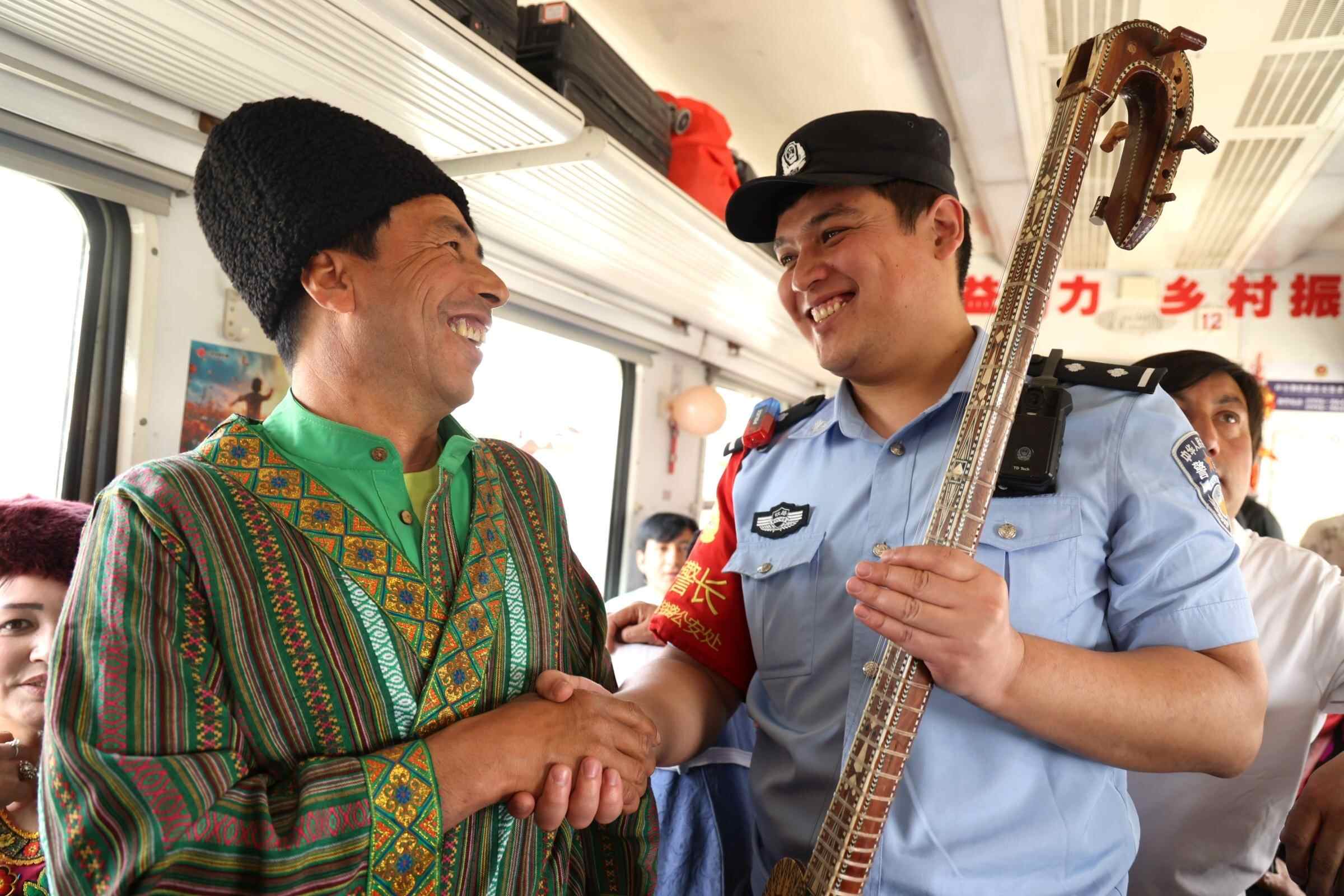 图为乘警与演出人员热情地打招呼,互致问候。武陇慧摄