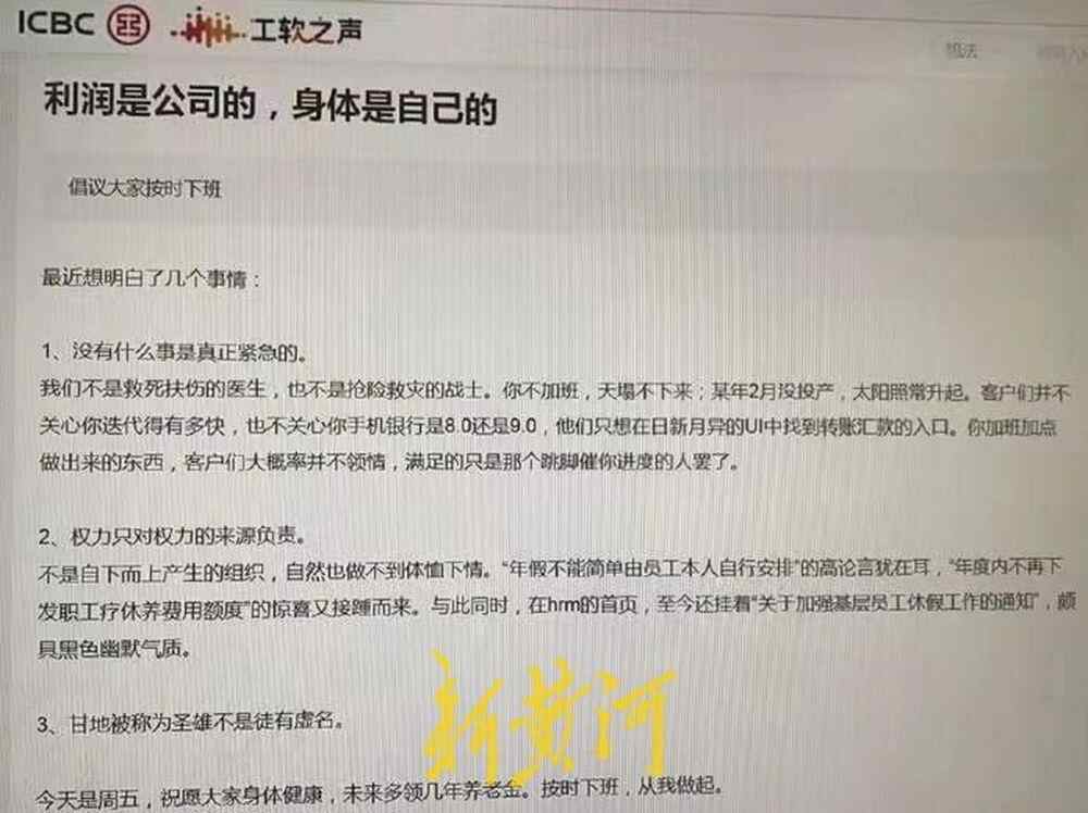 近日,网传中国工商银行员工在内部论坛“工软之声”发声抵制加班。网传图片显示,该页面左上角有工商银行的标志,文章名为《利润是公司的,身体是自己的》,发帖人在文中表达了对加班文化的不满,认为公司不断催促要求员工做的工作其实用处不大,并指出公司存在变相阻止员工休年假等压榨员工的做法。