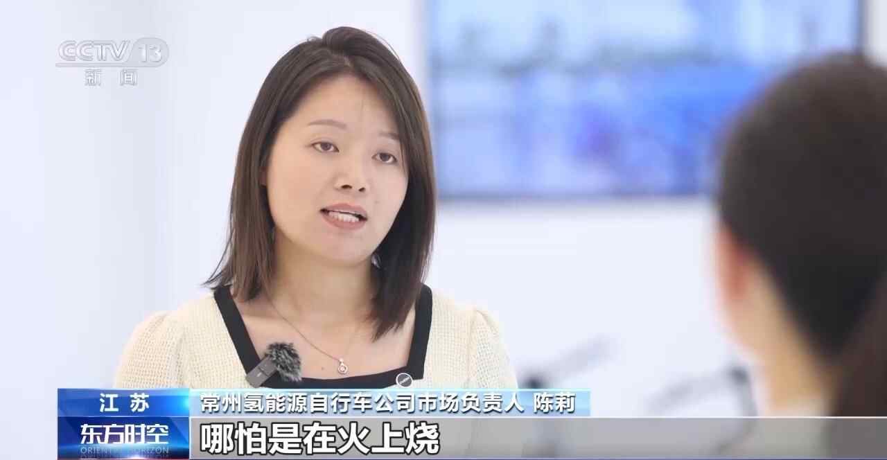 常州氢能源自行车公司市场负责人 陈莉:采用的是低压固态的一个储氢技术,它的瓶口有减压阀的设计,哪怕是在火上烧,压力达到8兆帕的时候,它就会自动泄压,它不会自燃或者爆炸。