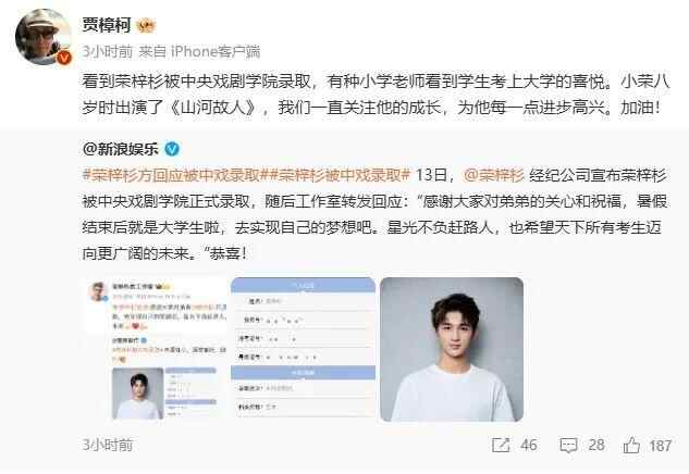 导演贾樟柯也转发微博表示祝贺,“看到荣梓杉被中央戏剧学院录取,有种小学老师看到学生考上大学的喜悦。小荣八岁时出演了《山河故人》,我们一直关注他的成长,为他每一点进步高兴。加油!”