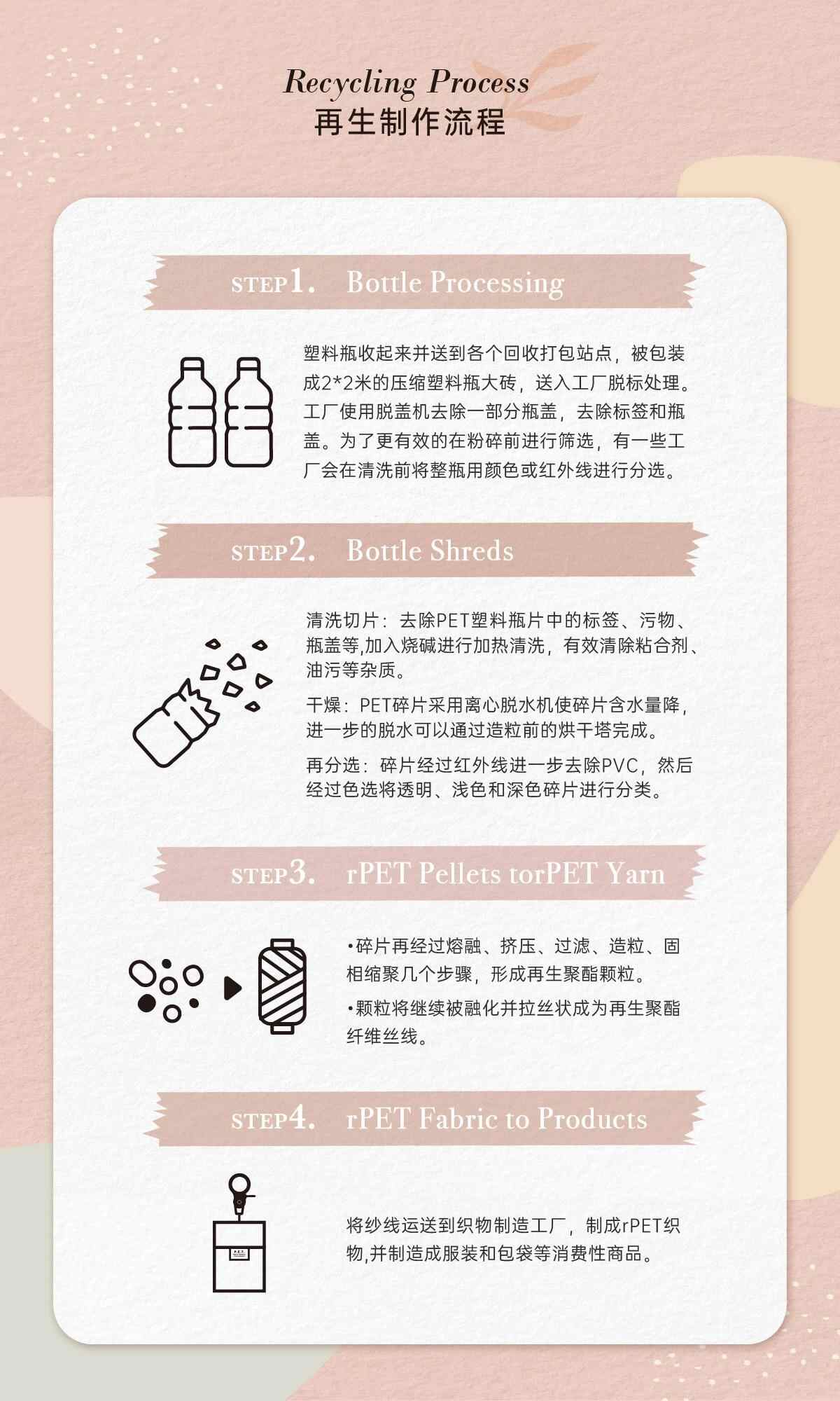 随后,使用离心脱水机使碎片含水量下降至1%左右,经过进一步脱水、熔融,挤压,过滤,造粒等成为聚酯颗粒,经过拉丝再生成为纱线,纺织厂经过织布、印染,加工制作后,一条漂亮的环保丝巾就诞生了。