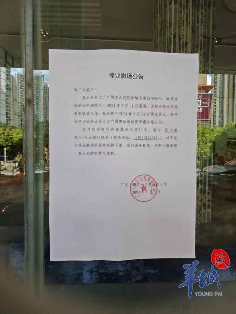 7月12日,羊城晚报全媒体记者走访赛马场内的马会家居发现,卖场的多个出入口玻璃门上已经张贴着“停业撤场”公告。公告显示:马会家居运营方广州市骏合展览策划有限公司表示,其承租的黄埔大道西668-28号场地已于2023年12月31日届满,为配合推进马场更新改造工作,公司将于2024年7月31日停止营业,并将场地交还给业主方广州赛马场运营管理有限公司,商户须在此期限前完成撤场相关工作。