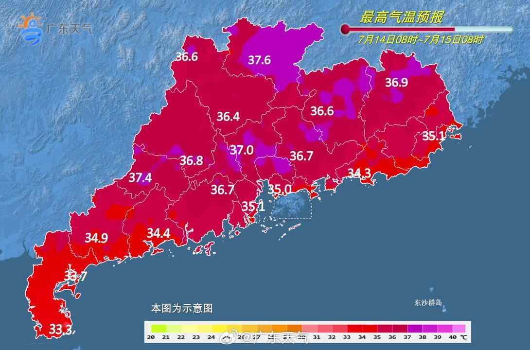 14日,广东大部分市县多云到晴,有(雷)阵雨,局部大雨或暴雨。最高气温:中北部市县35~37℃,其余市县32~34℃。